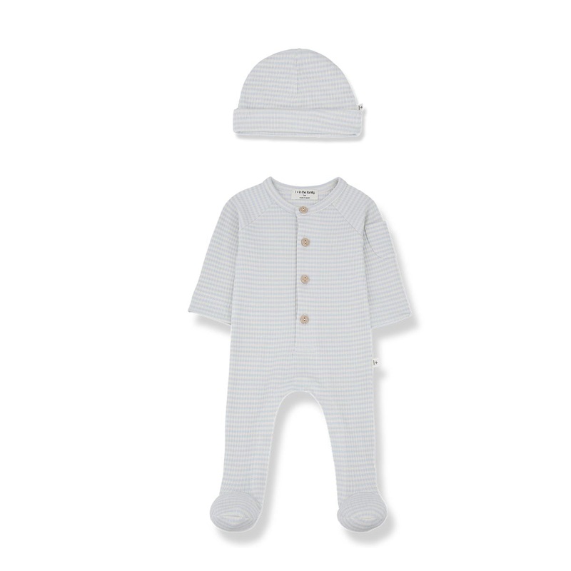 This 1+ in the Family Guim Footie & hat in Misty-Blue is the perfect set for your little one. Made with soft and comfortable fabric, this baby footie and hat provide both style and practicality. Keep your baby warm and cozy while also looking adorable. A m