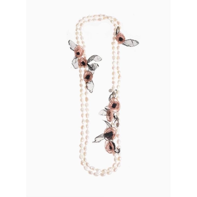 150 cm long necklace made of cultured pearls. Ornament of circular flowers of 2 cm in diameter made of fabric. These necklaces for women can be worn long, double or multi-round necklace.