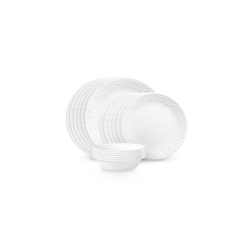 With beautiful floral scrolls, this dinnerware lends a subtle grace note to every place at the table. The embossed pattern gives each piece a delicate texture, and the tone-on-tone white design is the perfect backdrop for any food and looks great on any table. This has a 3-year limited warranty and is Made in the USA.