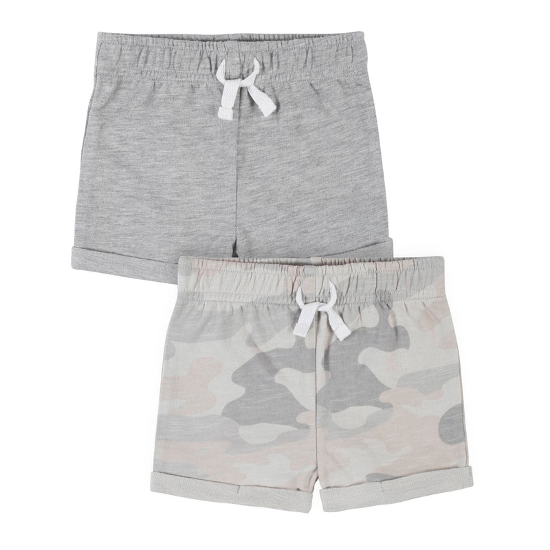 Modern Moments brings casual sophistication to your little ones wardrobe. Each of our 2-pack shorts are designed for easier changes and is made with super soft fabric for all-day comfort and easy care. We had our essentials independently certified with STANDARD 100 by OEKO-TEX so that you dont have to worry about harmful substances in your babys clothing. This pack includes two pairs of baby boy shorts with a gray color scheme.