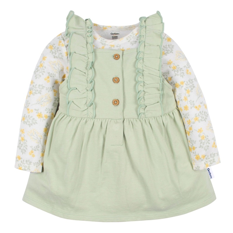 Your baby girl will look adorable and feel cozy in this cute two-piece outfit featuring a long sleeve Onesies Brand Bodysuit and comfortable, loose fitting jumper. Made from slightly stretchy material, the bodysuit makes diaper changes easy with convenient leg snaps. If necessary to remove the entire piece, shoulder flaps make it simple to pull the bodysuit down over the legs. Adorable shoulder ruffles add a unique touch to the jumper, while the cotton/polyester fabric blend works to protect against the cold. Our essentials have been independently certified with STANDARD 100 by OEKO-TEX so that you dont have to worry about harmful substances in your babys wardrobe. This two piece set includes one green jumper and one bodysuit with matching floral pattern.