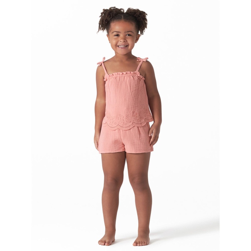 Modern Moments by Gerber baby and toddler girl 2 piece double layer gauze eyelet top and short are made of 100% cotton fabric thats cool, comfy, and gentle on sensitive skin. Our essentials have been independently certified with STANDARD 100 by OEKO-TEX so that you dont have to worry about harmful substances in your babys wardrobe. This set includes one sleeveless top with tie straps and one short in pink with eyelet trim details.