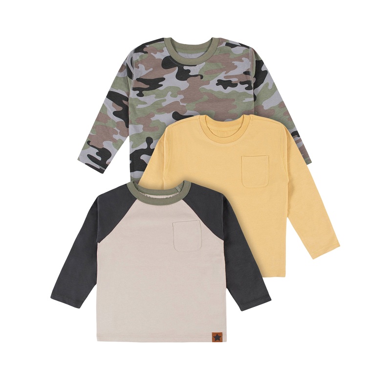 Modern Moments by Gerber brings modern sophistication and casual comfort to your little boys wardrobe. Our mix & match toddler boy clothes and baby boy clothes are made with soft cotton and blended cotton fabrics to keep your little one comfortable all day long. We had our essentials independently certified with STANDARD 100 by OEKO-TEX so that you dont have to worry about harmful substances in your babys nursery. This pack includes three boys’ long sleeve tees in gray and camo color schemes.