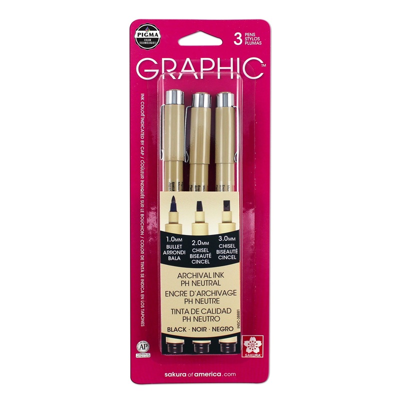 These high quality Pigma Graphic Pens are designed for professional drawing and hand-lettering. They deliver clean lines in bold black tones. These pens feature consistent ink delivery that will not smear or feather.3 pens: 1.0mm bullet, 2.0mm chisel, 3.0m