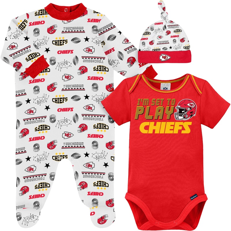 Boast your babys Chiefs pride with this 3-piece bodysuit, Sleep ‘n Play, and cap set! This officially licensed NFL outfit is made with a soft cotton and polyester interlock to keep baby comfortable and content all game long. The bodysuit features an expandable lap shoulder neckline with high-positioned bottom snaps to keep changes quick and simple. It also has a bright and bold, screenprint team logo front and center. The Sleep ‘n Play boasts a colorful print of your teams logos and helmets and features inner thigh snaps and a back placket for comfort and convenience. The knotted cap features a soft cuff for comfort and will keep your little one snuggly warm in cool weather This outfit is machine washable and dryable. It includes one bodysuit, one cap, and one Sleep ‘n Play.