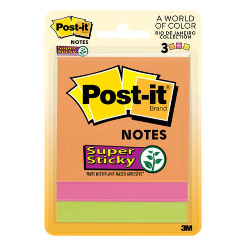 Use this pack of 3 colorful Post-It Sticky Note Pads to write reminders, important information, or thoughtful notes.3 pads of sticky notesDimensions: 3" x 3"Number of Sheets per Pad: 45Made with 67% recycled materialsStick to vertical and hard-to-stick sur