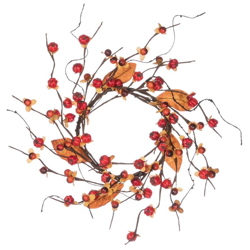 The warm autumn hues of this Bittersweet Accent Ring will give your home a fresh and festive look this fall. It features twigs, red berries, and golden leaves. Perfect for candles, centerpieces, and more!
