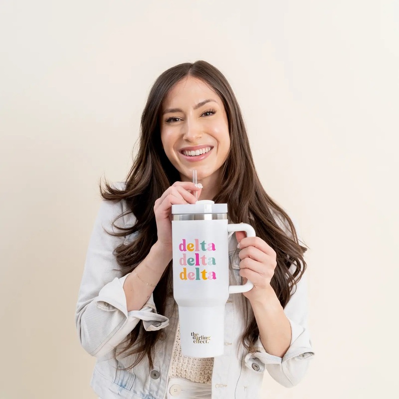 This hot, trendy cup style holds up to 40 oz of your favorite beverage. It fits in your cup holder and has a handle for easy sipping and carrying, perfect for on-the-go around campus and on road trips.