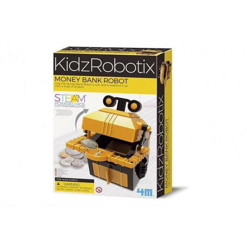 This cool little robot is hungry to help you save your coins. Place a coin in its hand and watch the robot swallow it. | 4M Money Bank Robot. Attributes:MPN: 34223Model: 10223202