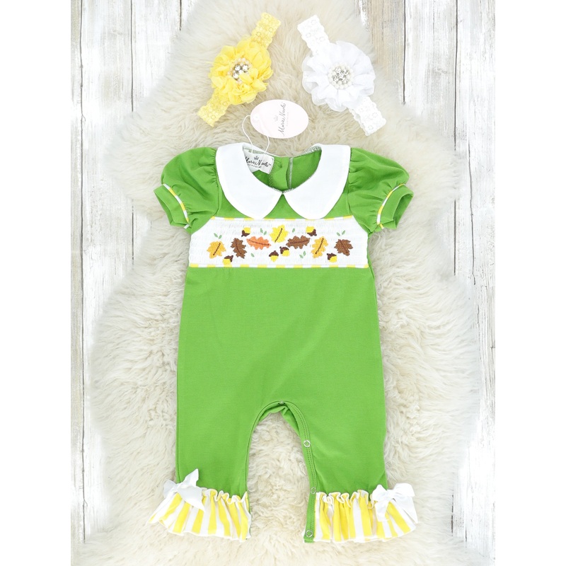 ThisunbeLEAFable sister setis perfect for the transition into fall! This green romper features smocking across the chest, embroidered acorns & leaves, a peter pan collar, ruffles details, & bow details at the ankles.
