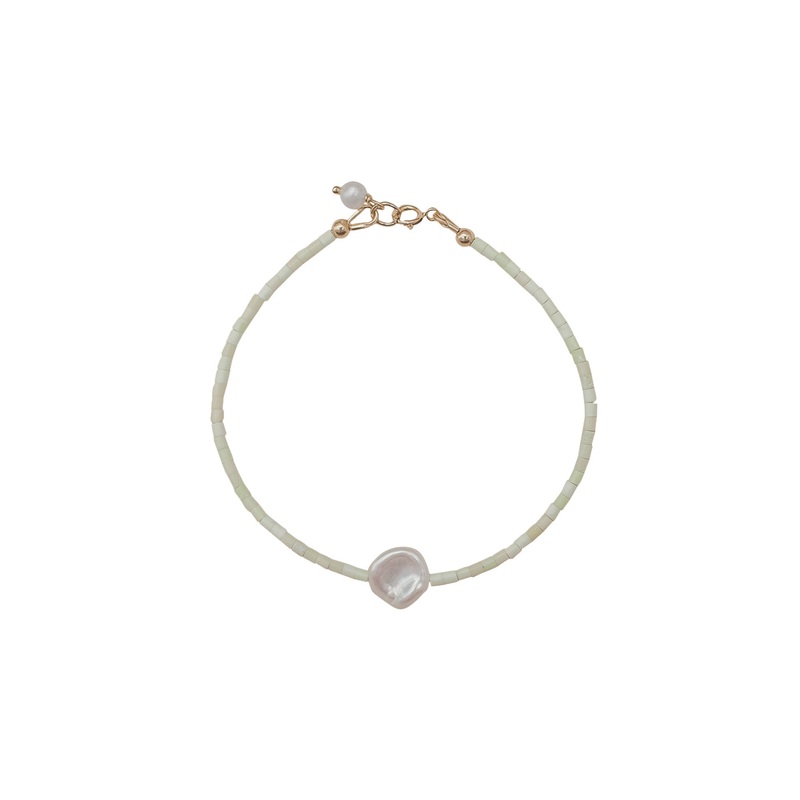 From Newport, Rhode Island, designer Kerry McGauley uses her experience in the fashion industry and inspiration from the towns picturesque shoreline to craft singular yet timeless piecesshining at the most memorable events and through your everyday. Adorned with a stunning freshwater pearl, and a dainty gold closure, the Ada Bracelet in Light Green is a subtle declaration of style, and elegant as can be.