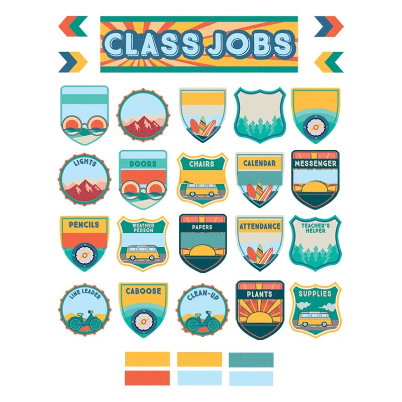 Adventurer Class Jobs Mini Bulletin Board SetTeach and encourage positive behaviors and responsibility in your classroom with a 57 piece class job Eureka mini bulletin board set.Packaged as eight 6" x 21" panels that include 1 Class Jobs Header (21" x 6"),