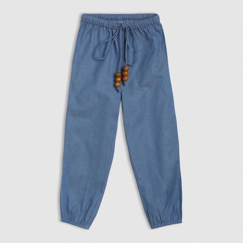 Comfortable cotton draw string pant with wood bead detail and gathered ankle.Chambray100% CottonMade consciously in India