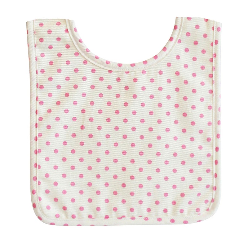 A classic linen bib so stylish why not use it every day! Meal time has never been so cute!Features:Quality ivory cotton with pink spots.Cotton absorbent backing.Velcro for gentle safe closure behind the neck.Machine washable.