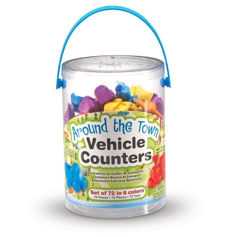 Set of 72 counters come in 6 different shapes and colors Figures include car, truck, airplane, train, bus, and sailboat Includes storage bucket and Activity Guide