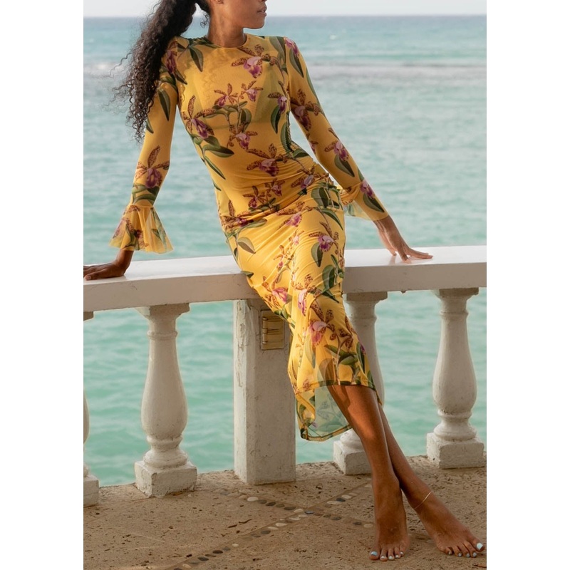 A mother to three little girls, Damaris Bailey imbues her feminine clothing line with all the optimism, courage, urgency, beauty and possibility that comes with motherhood. The result is a collection of romantic, vibrant pieces for thoroughly modern women. Embrace sophisticated style this summer with the Amari Midi Dress, crafted in a mesh material meant to hug the body, and designed with a slight ruffle at the wrists for a touch of romance. We love it for dinner town, but it works just as well as a cover up at the beach.