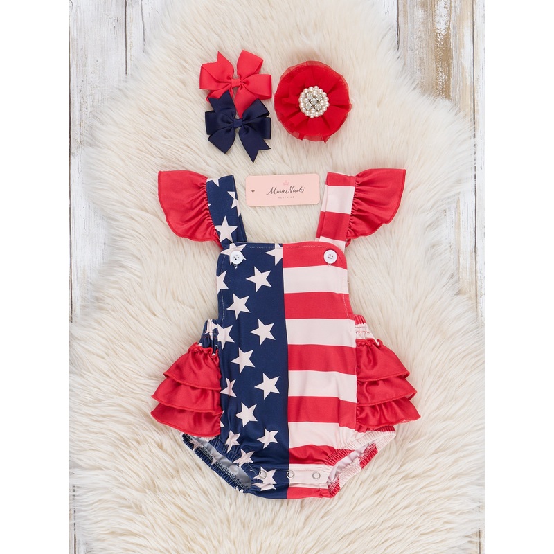 Get ready for some patriotic fun with our American Flag Ruffle Bubble by ! This adorable bubble features charming ruffle details, cute button accents, and of course, the iconic American flag. Perfect for sisters to match and show off their love for the USA. Stars and stripes and cuteness, oh my!