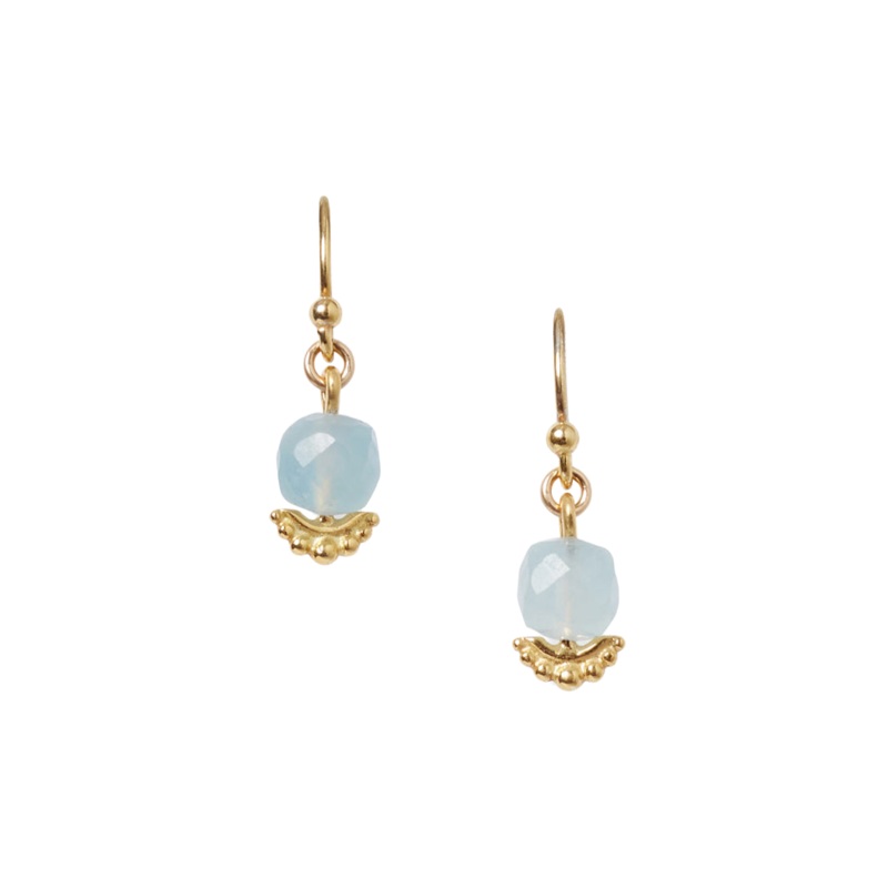 Designer Chan Luu creates homeware and jewelry that unites her passion for artisan-made crafts with a reverence for organic forms found in nature. Refreshing and ultra-cool, the Anahi Drop Earrings Aquamarine features petite aquamarine cubes with gold embellishments. These earrings sway from French hooks and create the most eye-catching dainty drop design.