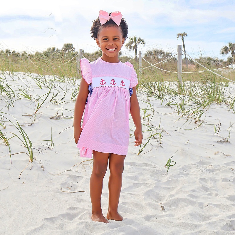 Elevate your little one's nautical style with the Anchor Smocked Pink Gingham Beverly Dress, the perfect outfit for a touch of charm. This pink gingham dress features smocked navy anchors with the sweetest navy side tie bows. Perfect for beach vacations, f