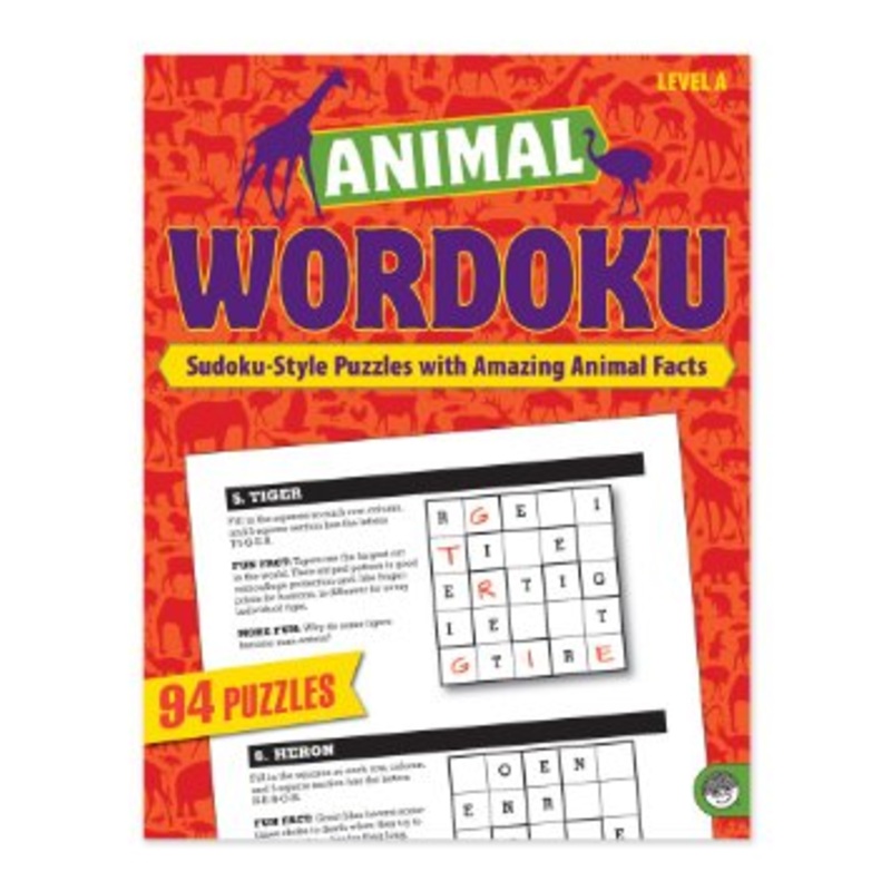 Animal wordoku, sudoku style puzzles with amazing animal facts. Each puzzle features a sudoku style grid and an animal. Place the letters from the animals name in each row, column and section of the grid to solve the puzzle. Puzzles become more challenging as you go through the book. A solution key in the back makes checking easier and helps kids fill in letters in case they get stuck. Each puzzle also includes an amazing fact about the animal and a research question stimulating childrens knowledge and fostering their ability to dig deeper.