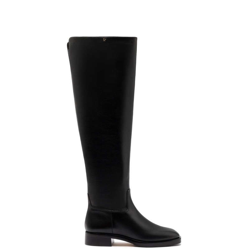 Bold colors, playful patterns, and chic silhouettes are hallmarks of Larroud, a shoe brand born of the pandemic from industry veterans and husband-and-wife team Marina and Ricardo Larroud. Manufactured in Brazil, Larroud shoes are designed with the consumer and community in mind, never compromising on style, fit, and quality. Named for Princess Anne and the flat equestrian-inspired boots she made famous, the Anne Hi Boot In Black Leather Leather has new modern details with the same perennial appeal.