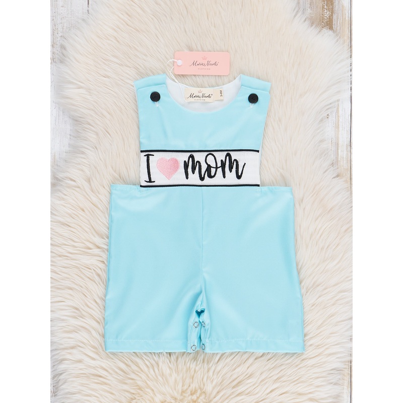 Asweet sibling set by for Mother's Day! This aqua johnny features smocking, an "I Love Mom" detail, & functioning buttons on the straps.Snap buttons.Fits true to size.100% Polyester.Import.Afterpay and Sezzle Purchase Requires $35 Minimum Order.
