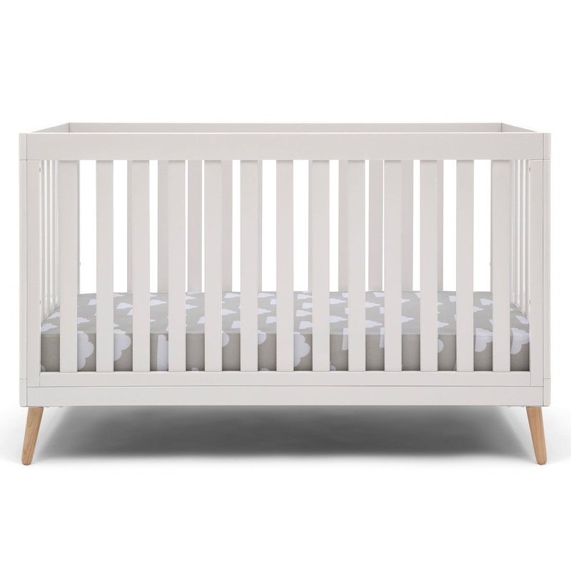 Delta Children Essex 4-in-1 Convertible Baby Crib, Bianca White/Natural Legs The Essex 4-in-1 Convertible Baby Crib by Delta Children is designed to elevate modern nurseries. It features gently curved corners and splayed feet in a natural finish for some r