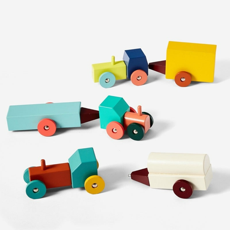 hovers tractors are crafted from contemporary shapes and painted in bright colorsa simple design that celebrates motor vehicles and the innovation, perseverance, and creativity they brought to the world. join the tractor engines and wagons by their embedded magnetic connectors to create your own playful arrangements.
