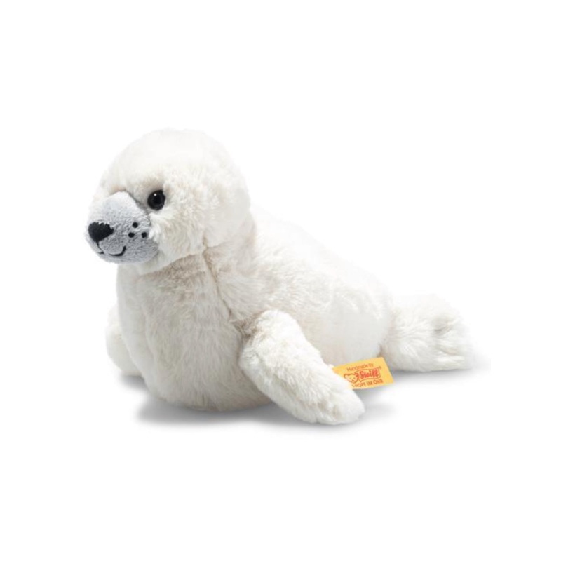 Measuring 20 cm, Soft Cuddly Friends Aro Howler is a proud Steiff seal pup made of soft, bright white plush with a short-pile, grey snout.
