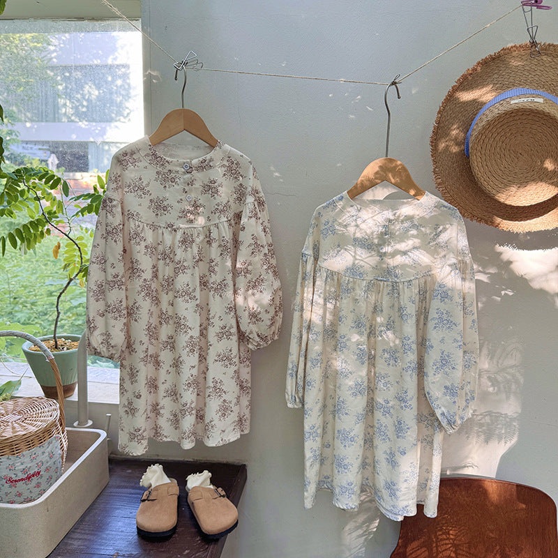 This charming autumn dress features a delicate floral pattern set against a soft fabric, designed specifically for girls. Its long sleeves and crew neck offer gentle coverage and comfort during cooler days, while the loose silhouette ensures ease of moveme