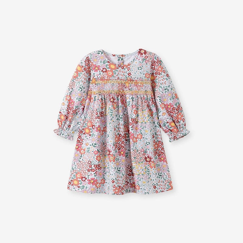 This charming autumn dress features a playful floral pattern perfect for lively girls. With long sleeves and a cozy crew neck, it keeps your little one comfortable during cooler days while adding a splash of seasonal fun to her wardrobe. Ideal for school,