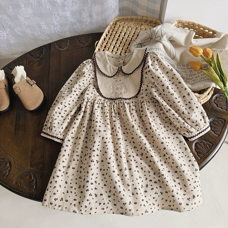GWIL528534382Arrival Autumn Girls Teddy Bear Embroidery and Floral Pattern Long Sleeves Dress