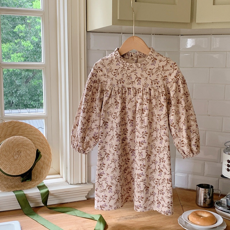 GWIL528534255Arrival Autumn Girls Vintage Flowers Pattern Long Sleeves Ruffle Neck Dress