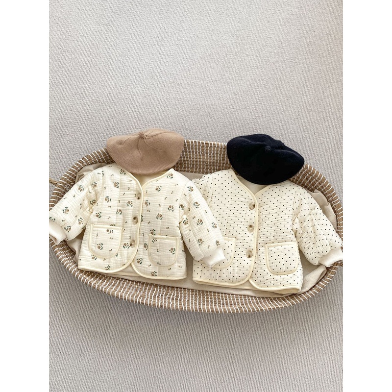 Keep your little one cozy and cute with this playful thick jacket coat featuring a charming dots pattern and a stylish V-neck design. Perfect for chilly days, it combines warmth and fun, making every outing a joyful adventure. Warm & Cozy: Thick jacket des