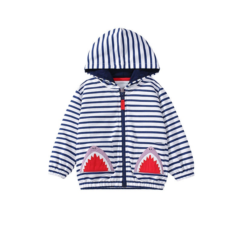 Keep your little one cozy and stylish with this playful shark-patterned zip-up hoodie. Featuring fun stripes and handy pockets, its perfect for everyday adventures and adds a splash of whimsy to any outfit. Easy to wear and sure to bring smiles! Playful Sh