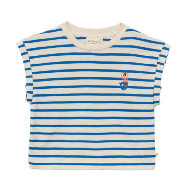 arsene & les pipelettes fania striped t-shirt in electric blue. this cute summer tee has a slightly cropped, boxy fit with cuffed sleeves and a mermaid embroidered on the chest.100% organic cottonmade in portugal