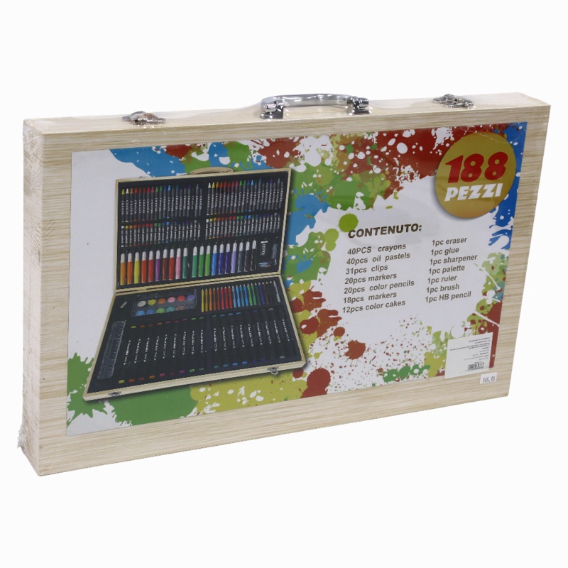 Unleash your childs creativity with this comprehensive 188-piece wooden box artistic set. Packed with a wide range of art supplies, its perfect for young artists to explore drawing, coloring, and crafting with everything neatly organized in a durable woode