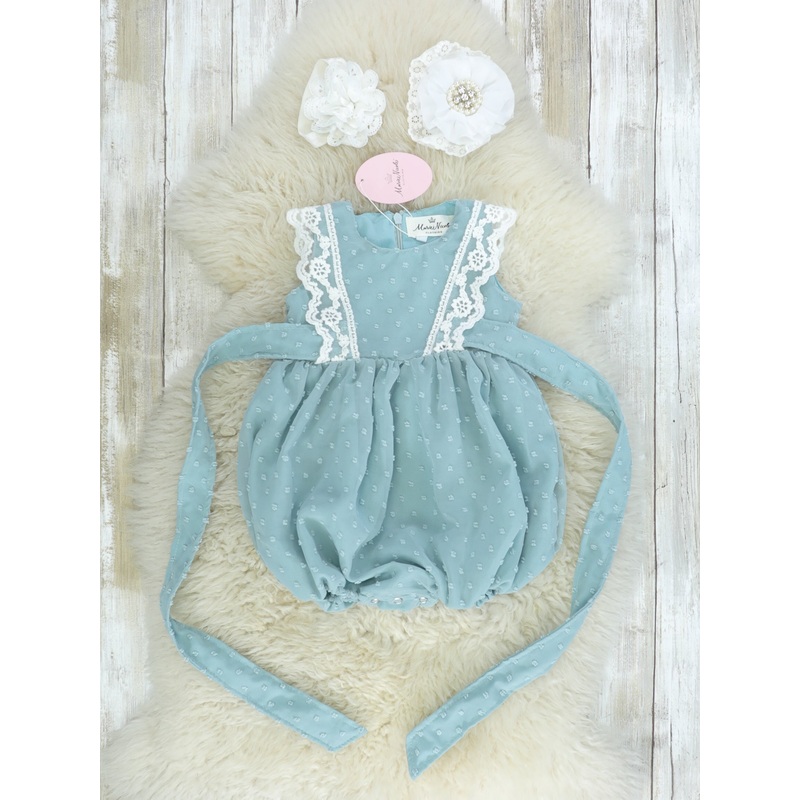 This MNC exclusive sister set is perfect for any special occasions your littles have planned during those warmer months! This ash blue bubble romper features a precious Swiss dot pattern, embroidered lace details, an adjustable tie around the midsection, a