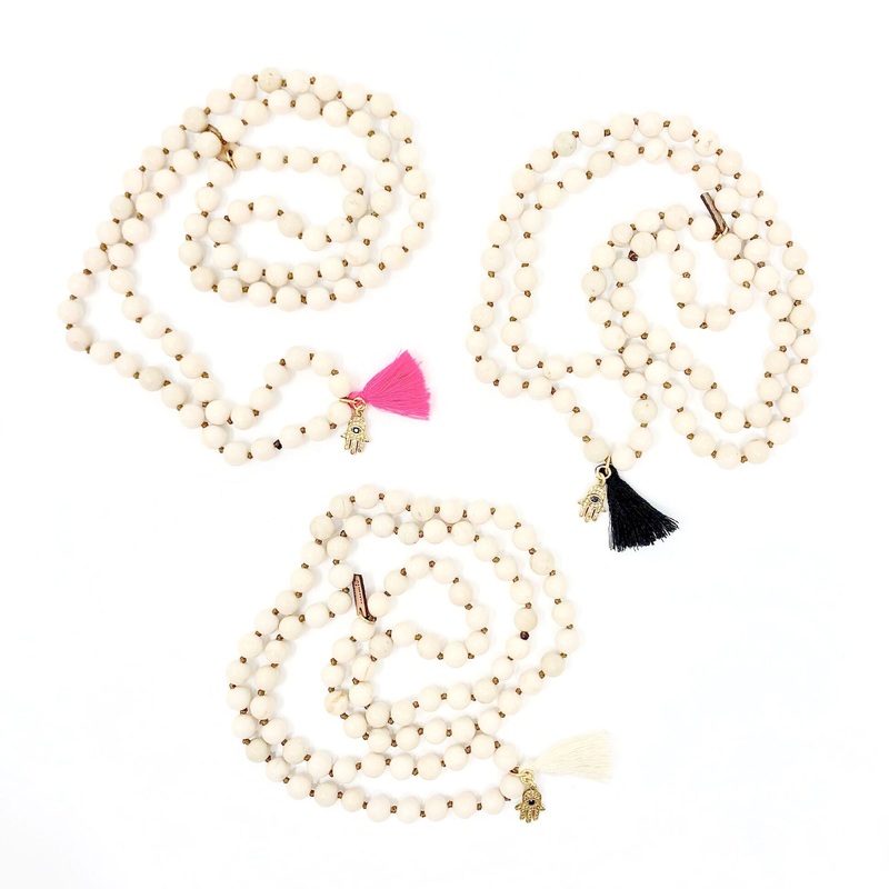atsuyo et akiko new girls collection hamsa wooden beads necklace. features a beautifully knotted bead style necklace with bejeweled hamsa and contrasting tassel detail. available in black, ivory or pink. 17" in length.made in brooklyn usa.