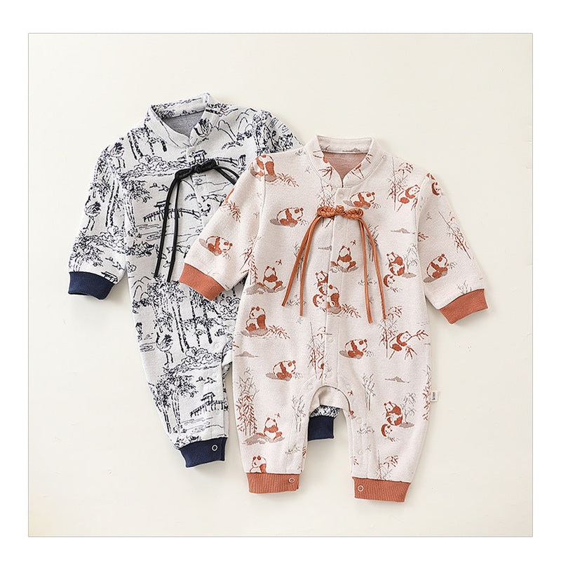 Dress your little one in charm with this playful romper featuring a delicate Chinese painting pattern. Designed for autumn and spring, it offers long sleeves and a stand collar to keep your baby cozy. The single-breasted front makes dressing easy, combinin