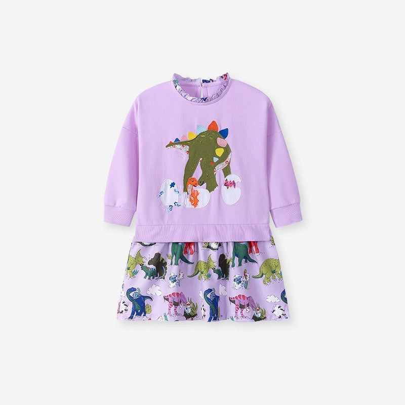 Get ready for fun with this playful long-sleeve dress featuring adorable cartoon dinosaurs! Perfect for autumn and spring, it keeps your little one cozy while adding a splash of style to her wardrobe. The lively dinosaur pattern sparks imagination and joy, making it a favorite for any stylish girl who loves a bit of prehistoric charm.