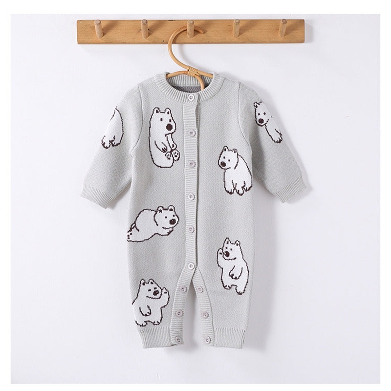 Keep your little one cozy and cute this autumn and winter with these adorable unisex knitted rompers. Featuring a simple polar bear pattern and long sleeves, they provide warmth and comfort for chilly days. Perfect for playful adventures or snuggly naps, t