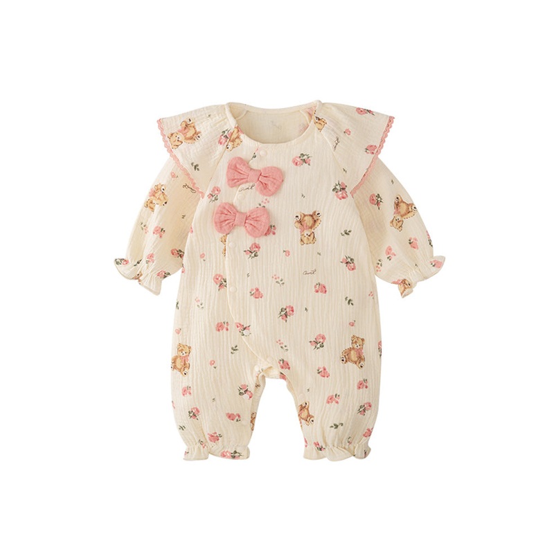 Celebrate the charm of autumn with this adorable romper designed for baby girls. Featuring a delightful mix of flowers, teddy patterns, and butterfly bows, it adds a playful touch to your little ones wardrobe. Soft and comfortable, its perfect for keeping