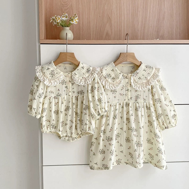 Dress your little princesses in this adorable Autumn set featuring a charming flowers pattern. The long-sleeved onesie and matching dress both come with a sweet collar, perfect for capturing that playful sisterly style. Cozy and cute, this set keeps your b
