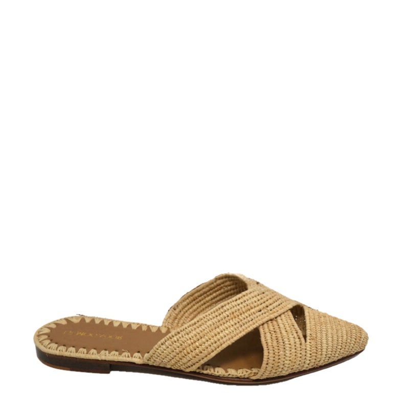 Raffia upper. Leather insole, outsole. Slip on. Almond toe. Closed toe. Criss-cross straps.