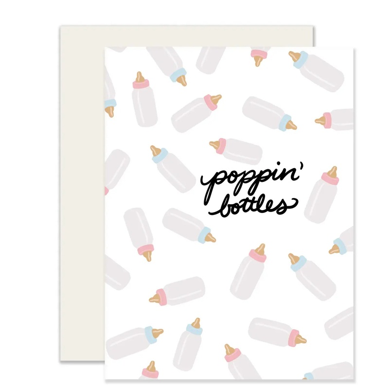 Poppin' (baby) bottles and toasting to your new addition! A2 size card & envelope (4.25 x 5.5") Folded card, blank interior Printed full color on cream 110lb cardstock Designed & printed in the USA