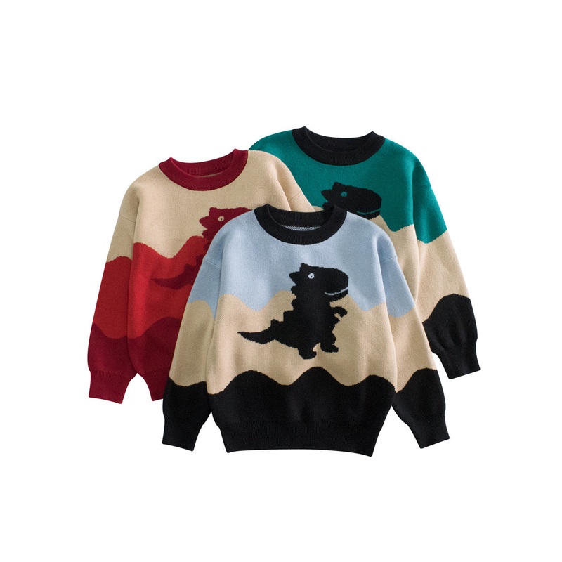 Baby Boy Kids Dinosaur Pattern Crew Neck Long Sleeves Color Patchwork Knitwear Pullover