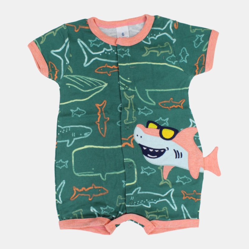Your little one will love the playful design of this Baby Boys Romper. Made from soft cotton, it features an exciting shark print on a vibrant green background, perfect for active days full of fun and adventure.