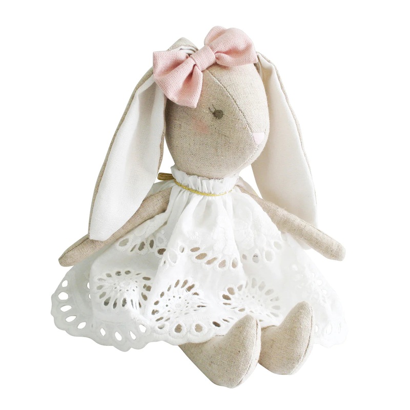 A super cute baby bunny! Dressed in a gorgeous ivory brodiere dress. A great companion to our mummy broderie bunny. She will become your treasured keepsake. Suitable from 3 years.Features:Linen cotton body with all new poly fibre fillGorgeous ivory brodier