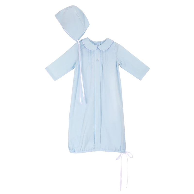 Using artisan seamstresses to craft small orders of their heirloom pieces, Strasburg Childrenpaysspecial attention to detailsFrench seams, built-in slips, and fabric-covered buttonsfor lasting quality and comfort.An adorableoption for bringing baby from the hospital or for first portraits, theBaby Day Gownfeatures delicate picot trim around the collar and cuffs, tiny pin tucks, full lining, and a handcrafted embroidered rattle on the center pleat. Our favorite part: mother-of-pearl buttonsfor added comfort.